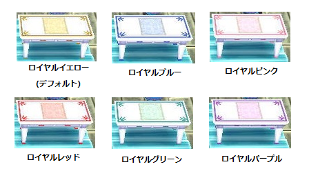 | おうごんのテーブル おうごんのトーチ おうごんのイス おうごんのながいす おうごんのタンス おうごんのゆか おうごんのかべ おうごんのとけい おうごんのクロゼット おうごんのスクリーン おうごんのベッド おうごんのせんしぞう おうごんのふじんぞう | きんこうせき×3 | 10000ベル | 家具:8000 壁紙・じゅうたん:15000 | ※出来る家具はランダム |