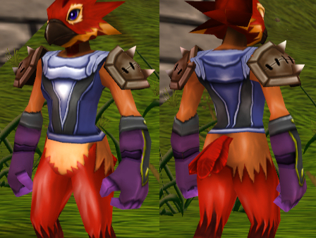 胸装備の袖が長く、腕装備が隠れてしまう。1枚目中央の肩付近の紫の紐?が腕装備